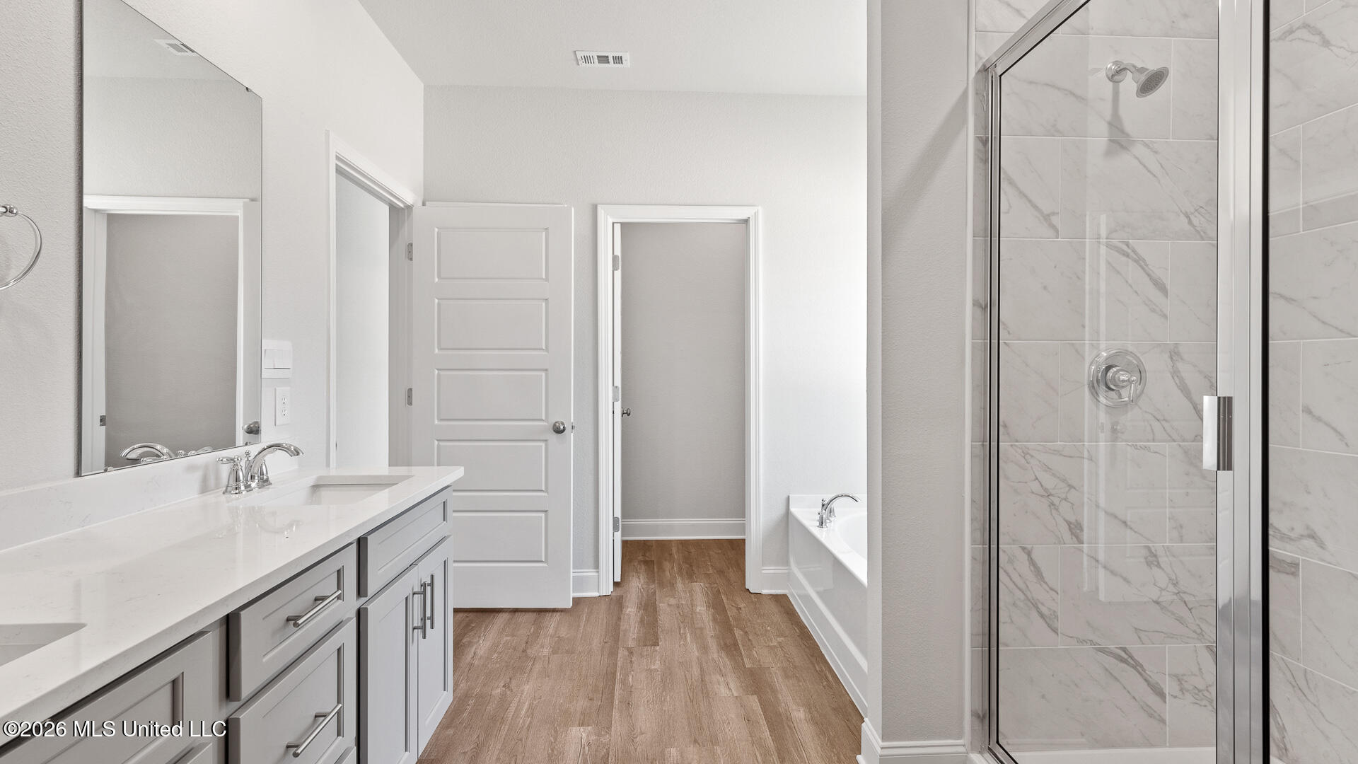 The primary bedroom, located at the back corner of the home for privacy, has an ensuite bathroom with a double sink vanity, separate shower and garden tub with a spacious walk-in closet providing ample space for storage.