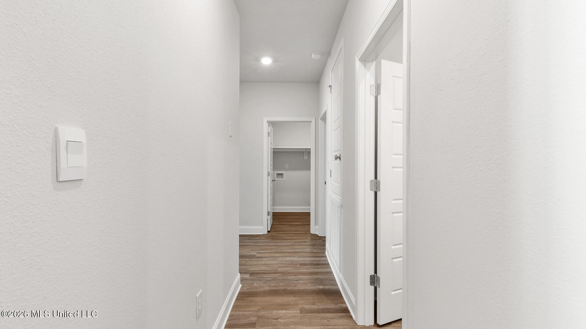 Entering the home through the front foyer is a short hallway with three bedrooms. These bedrooms have access to a full bathroom with a shower/tub combination. The laundry room is located here for convenience. To the adjacent side of the foyer is a half bathroom and garage access.