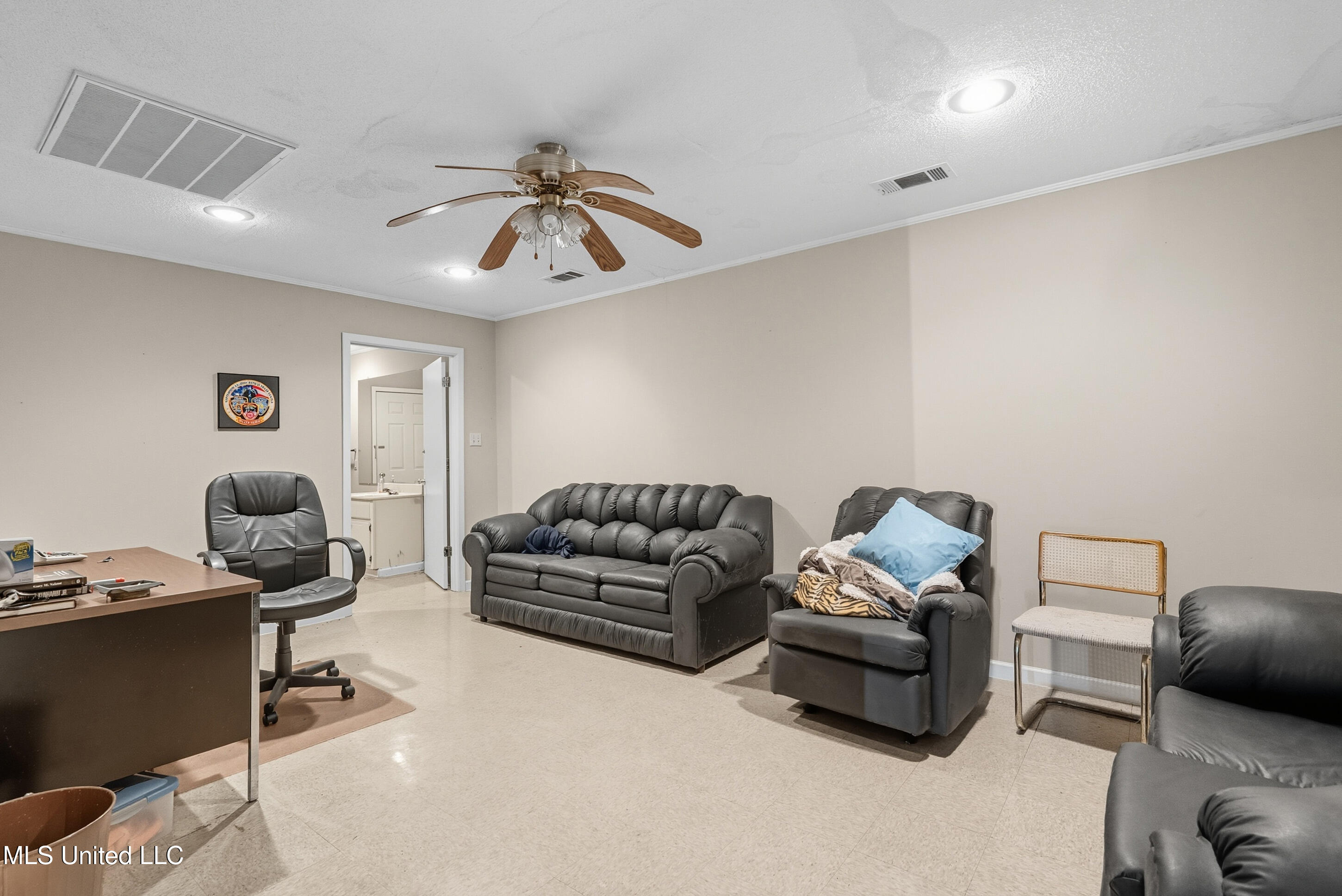 workspace. Additional features include an office area, restroom, and storage space, making it
