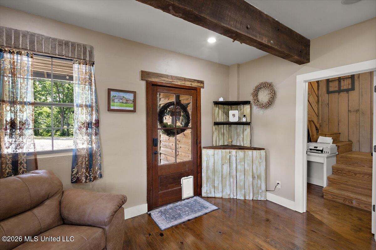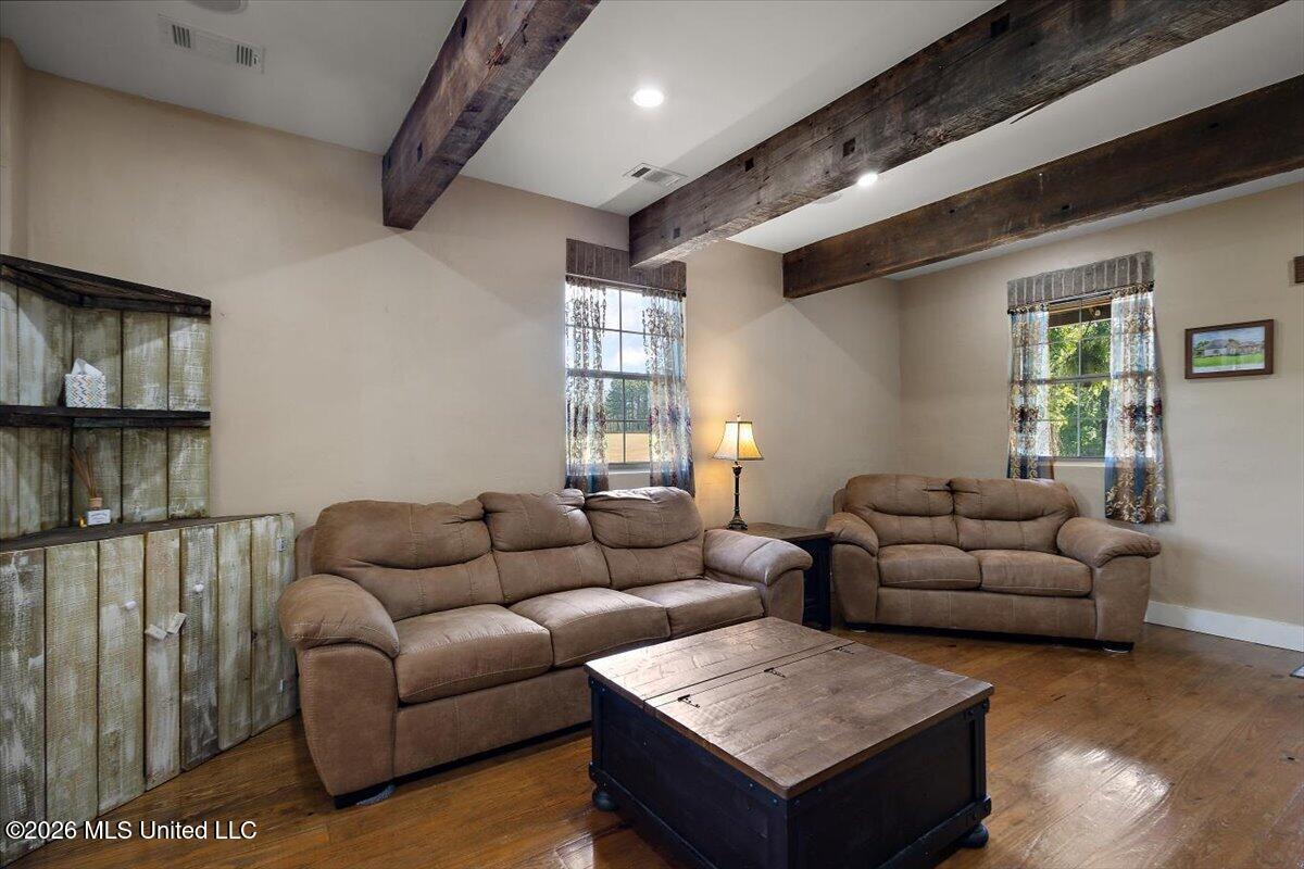 Tucked away in the highly sought after Clarkdale school district, this exceptional property offers privacy, space, and unique craftsmanship on 12 open acres surrounded by serene woods. This fully furnished home features 3 bedrooms, a spacious living room with soaring ceilings, and striking oversized wood beams repurposed from the historic Meridian hotel. The interior showcases pine flooring milled directly from trees on the property, along with granite countertops in both the kitchen and bathrooms. The kitchen is equipped with stainless steel appliances, while modern conveniences include Alexa-compatible smart thermostats, a central vacuum system, and a wired surround sound speaker system throughout the home. Step outside to enjoy a beautifully designed backyard featuring a large open space and a stunning 18' round pond with a cascading waterfall feature. The back porch is an entertainer's dream, complete with a built-in bar, propane stove, and mounted TV. Perfect for hosting gatherings or relaxing evenings. Don't miss out on this beautiful home!