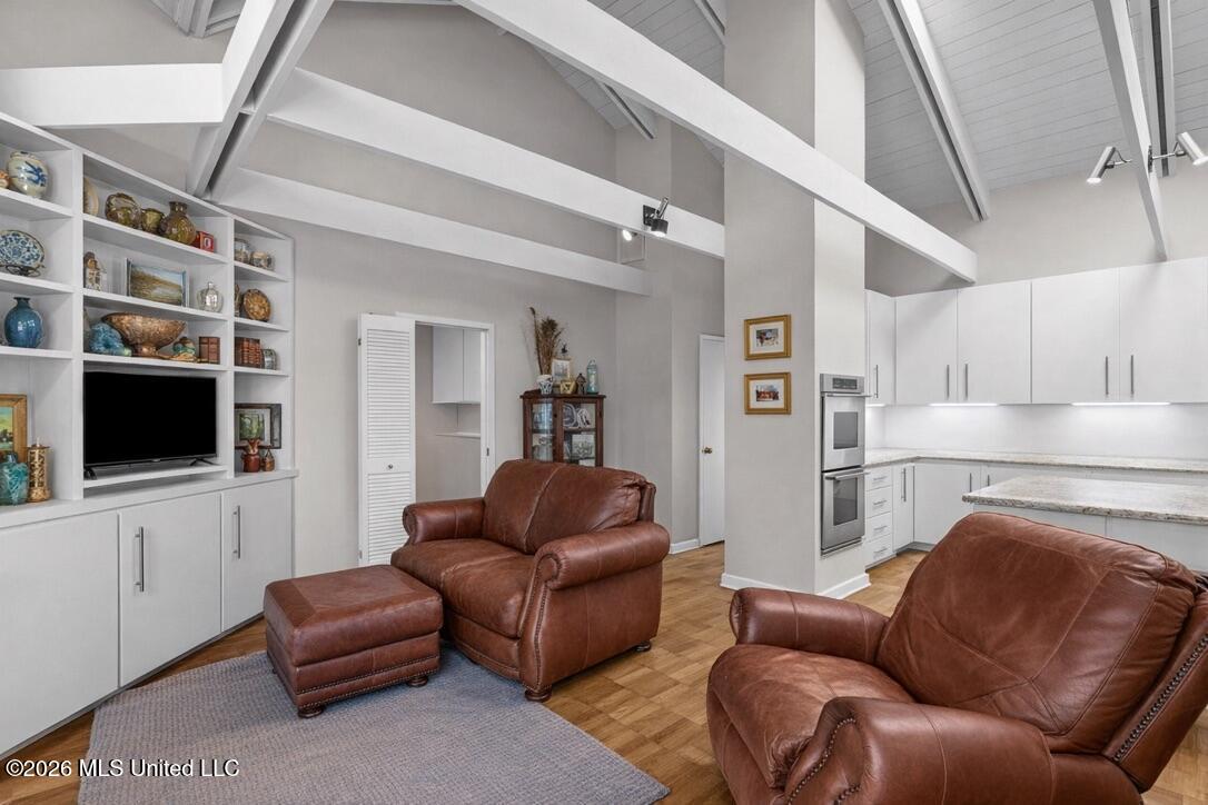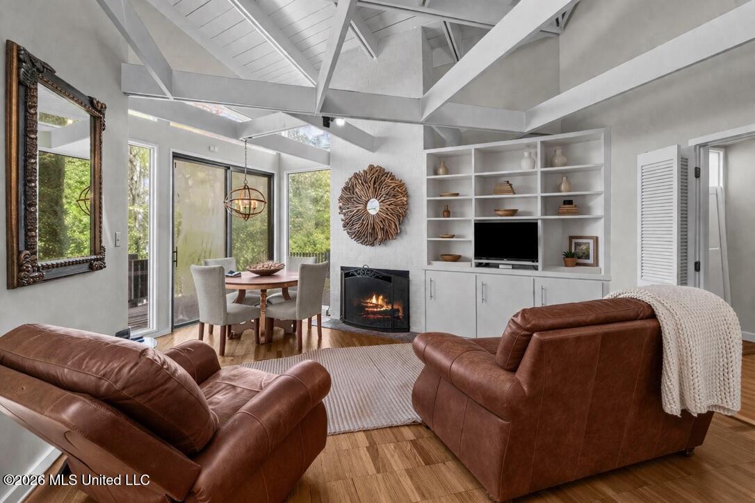 Inside, you'll find soaring vaulted ceilings with exposed beams, creating a light and open feel throughout the main living areas. The spacious living room features a cozy fireplace and built-in shelving, making it ideal for both relaxing and entertaining.