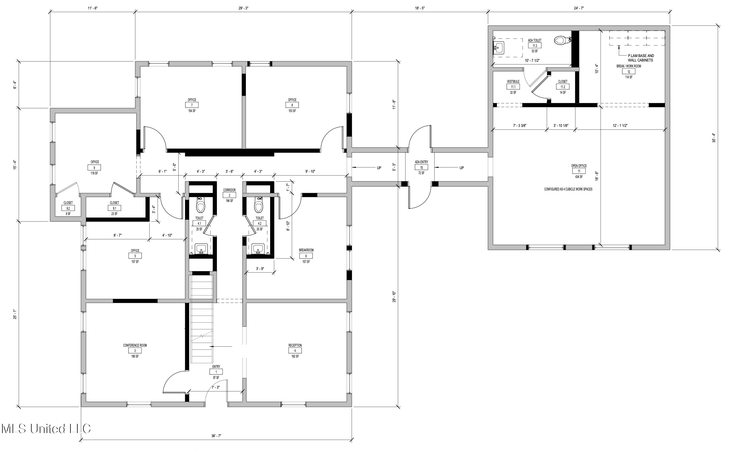 The main building features a welcoming reception area, conference room, breakroom, and two bathrooms, along with four offices on the main level and two additional offices upstairs. A covered breezeway provides ADA-accessible entry and connects to a secondary office suite with four built-in cubicles, an additional breakroom, and a large ADA-accessible restroom, offering excellent flexibility for teams or departments.