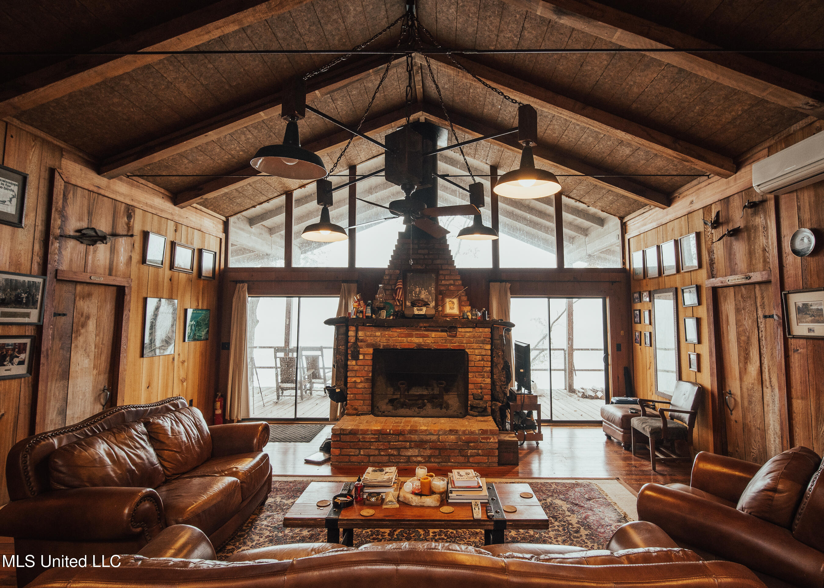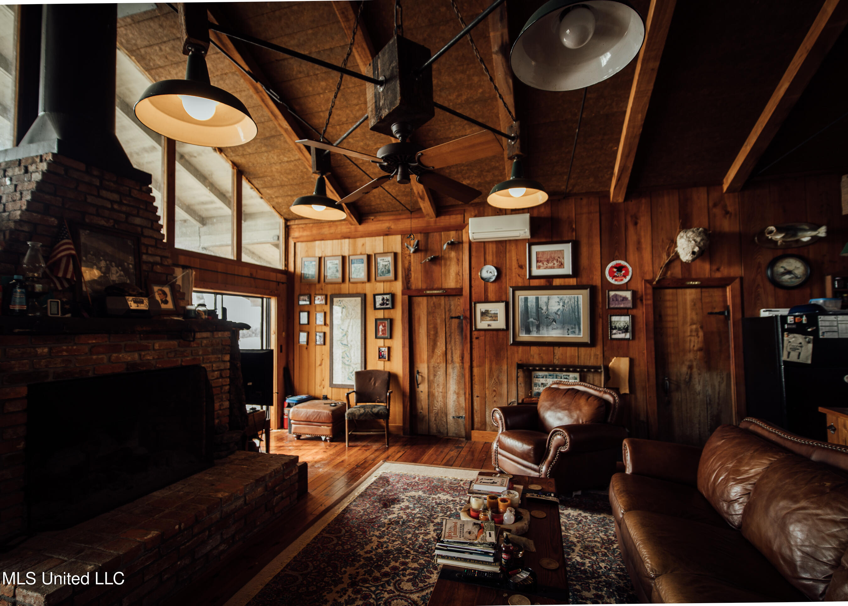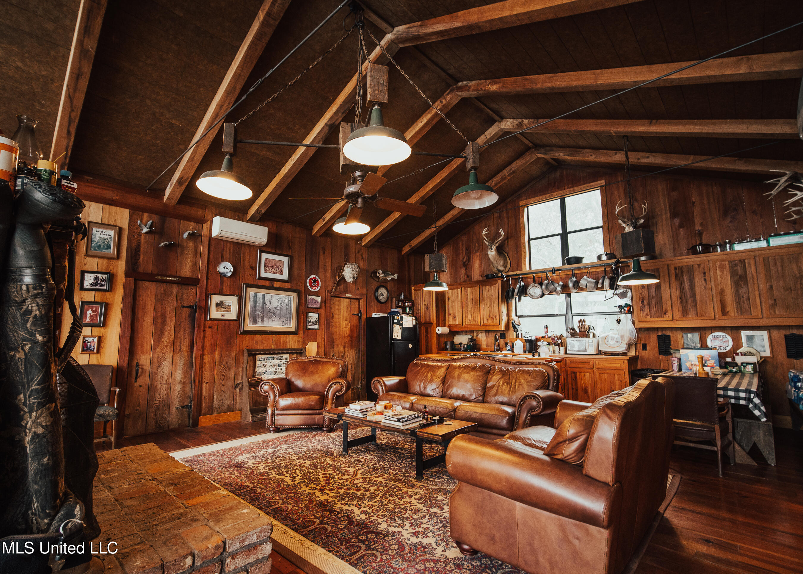 family cookouts or a place to enjoy a cup of coffee while overlooking the water. As you enter the 1,408± square foot cabin, you will appreciate the old 1933 heart yellow pine interior with a real wood-burning fireplace that screams, ''Come on winter!'' The beautiful cypress flooring will quickly catch your eye. The great room and kitchen area share a vaulted ceiling with a rustic river bottom